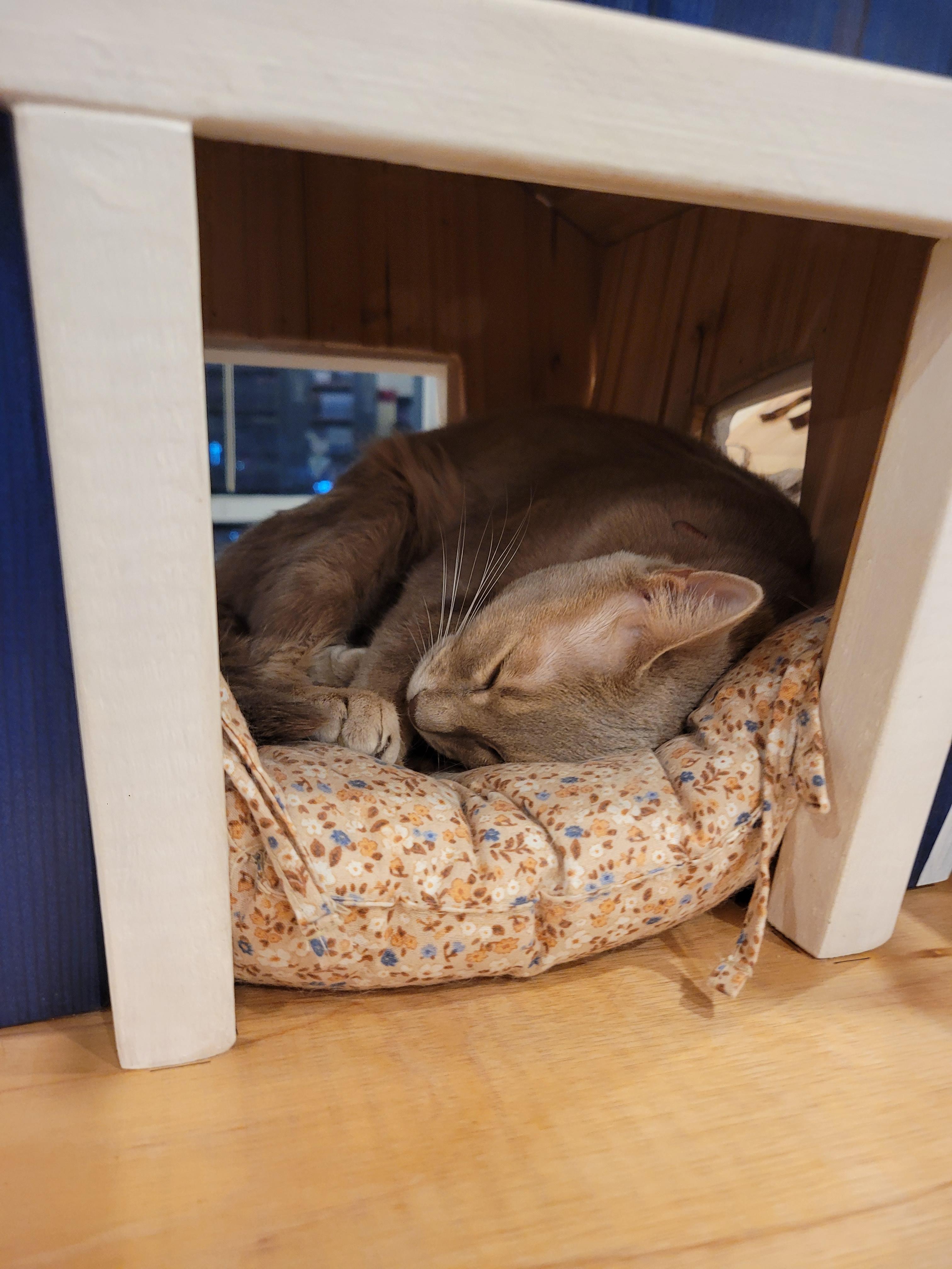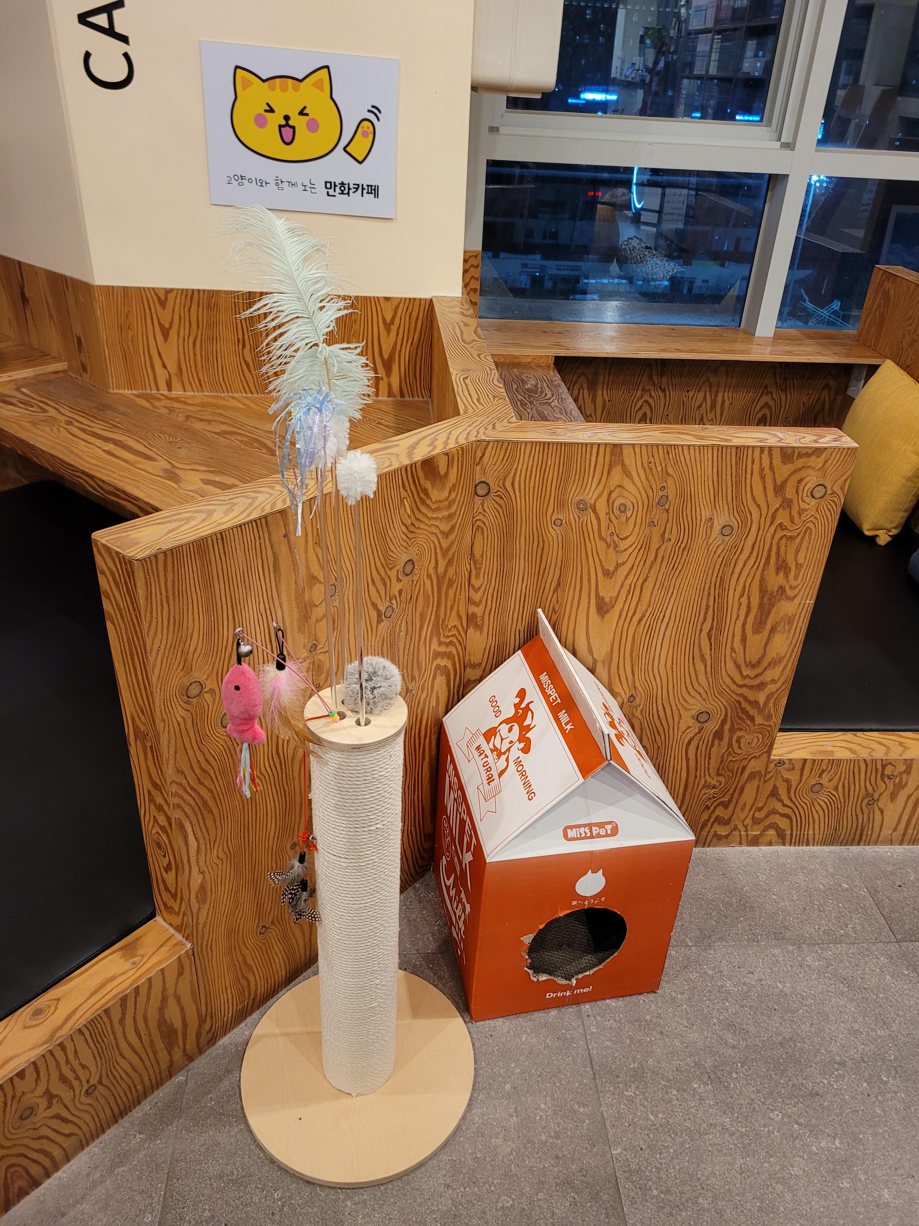 곳곳에 고양이와 함께 놀수 있는 장난감들과 고양이들의 침대들이 있어서 야행성인 고양이들은 낮에는 이곳에 들어가서 휴식을 취하더라구요.